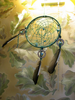 | Cделала для себя в пору жарких кошмаров горячего московского лета 2010. Основа - деревянные пяльца. Нитки - мулине двух цветов, синий люрикс. Перо сойки. Крашеные ракушки. Бисер toho. Костяные круглые бусины с выжиганием. Крошка бирюзы. Дымчатый кварц. Несмотря на сумбурный набор материалов, работает как фильтр излишней эмоциональности в сновидениях. Облегчает контроль и понимание сна. |